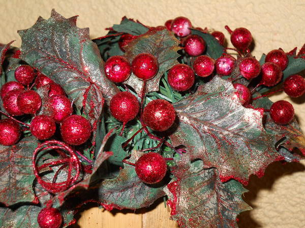 Girocandela natalizio in poliestere con foglie di agrifoglio e numerose bacche rosse con glitter in tono.Decorazione dal deciso sapore natalizio può essere utilizzato anche come decoro a centrotavola senza la presenza di candele, é compatto e al tempo stesso ordinato nella distribuzione degli elementi decorativi, leggero e resistente é utile per arricchire candelabri dalle dimensioni medio-grandi.