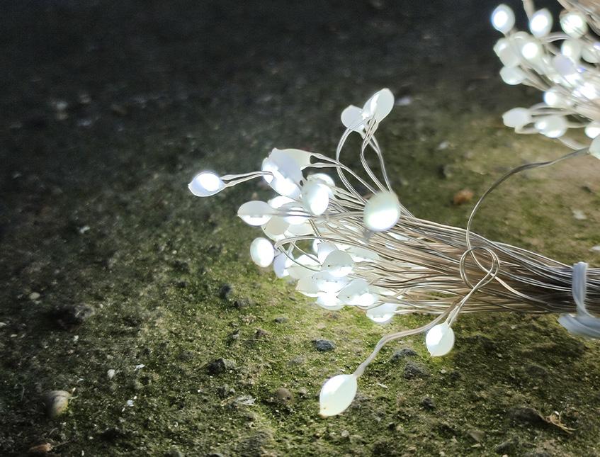 Tenda luminosa con 20 punti luce distanziati ogni cm.15 da cui escono 5 fili metallici da cm. 50 con 5 led luminosi per un totale di 500 Led, i fili da cm.50 sono animabili e si può dare qualsiasi movimento desiderato, creando spazi di volume e trasparenza davvero invidiabile. Sono disponibili sia a luce fredda che a luce calda.