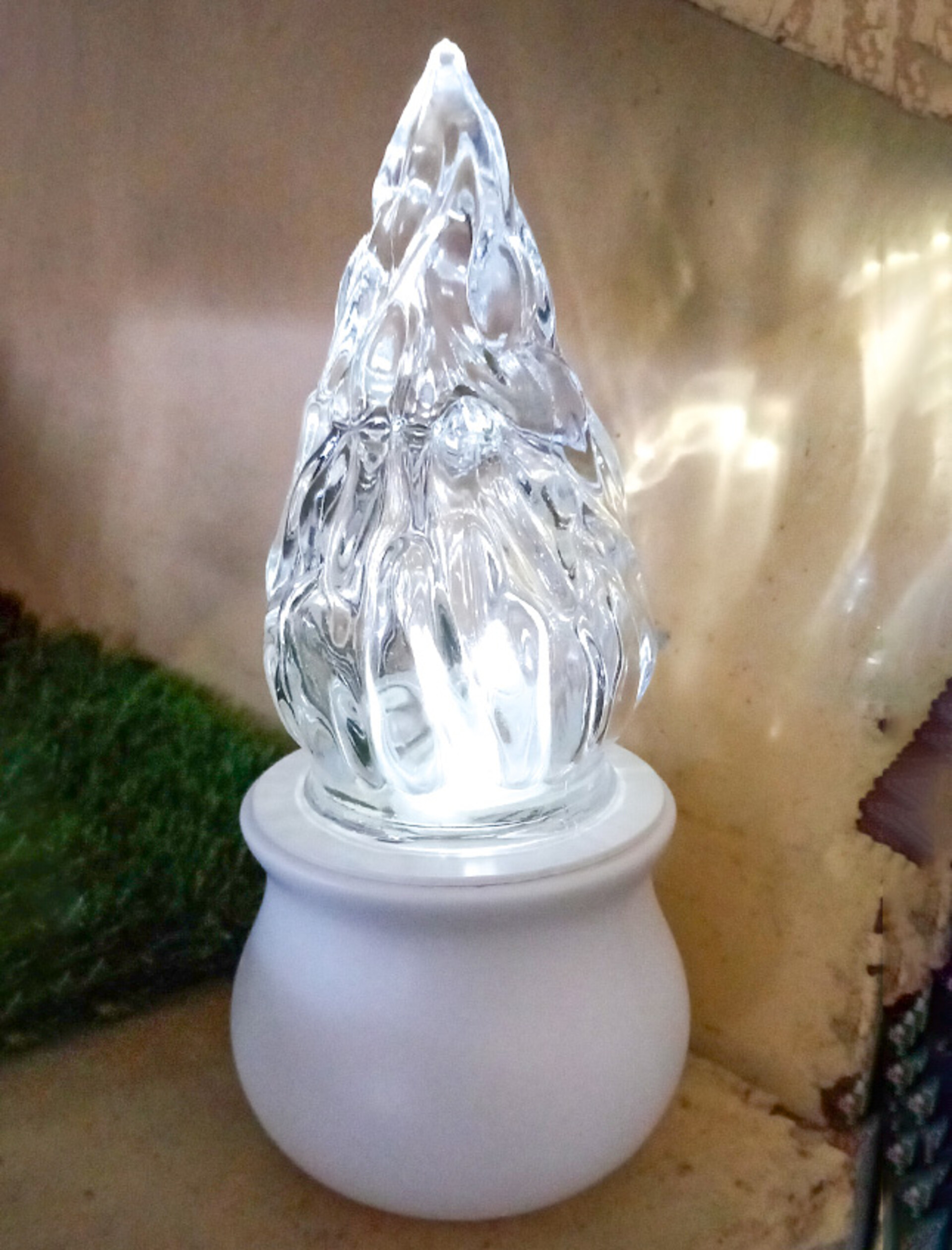 Lumino elettrico con base in plastica color avorio ed involucro superiore modello fiamma in vetro trasparente. Resistente alle intemperie, per interno ed esterno, con fiamma in plastica.