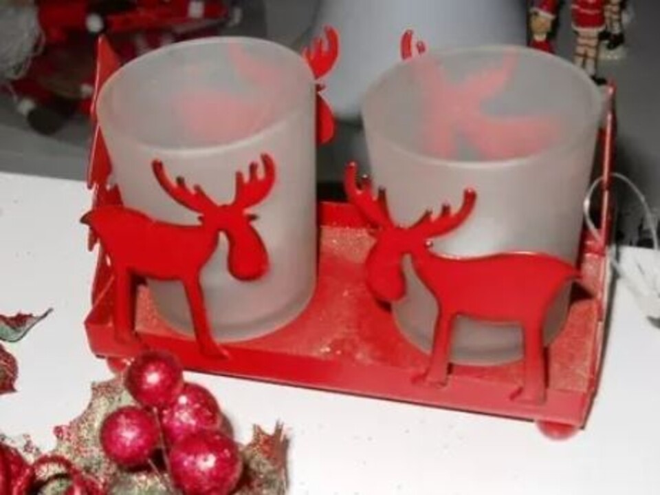 Lumino in latta smaltata rossa con due portacandela interni in vetro, sui lati sono presenti figure natalizie come renne e alberi di natali. Elemento natalizio adatto come centrotavola o segnaposto a tavola durante le feste, é compatto, robusto e destinato a durare nel tempo. Interpretabile come piccolo pensiero natalizio da regalare ed inserire tra i doni sotto l'albero.