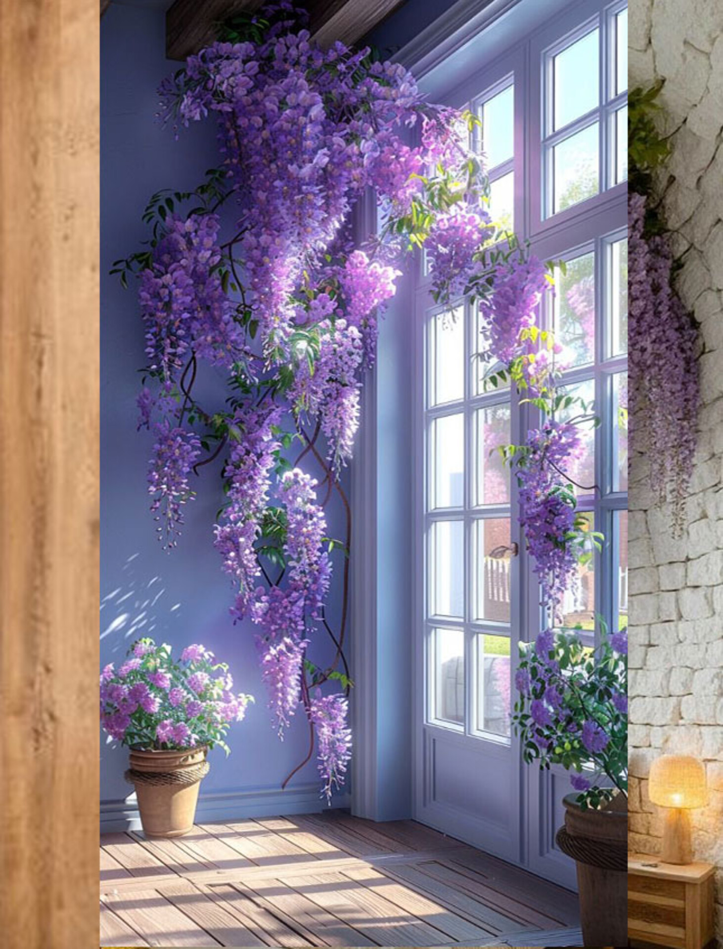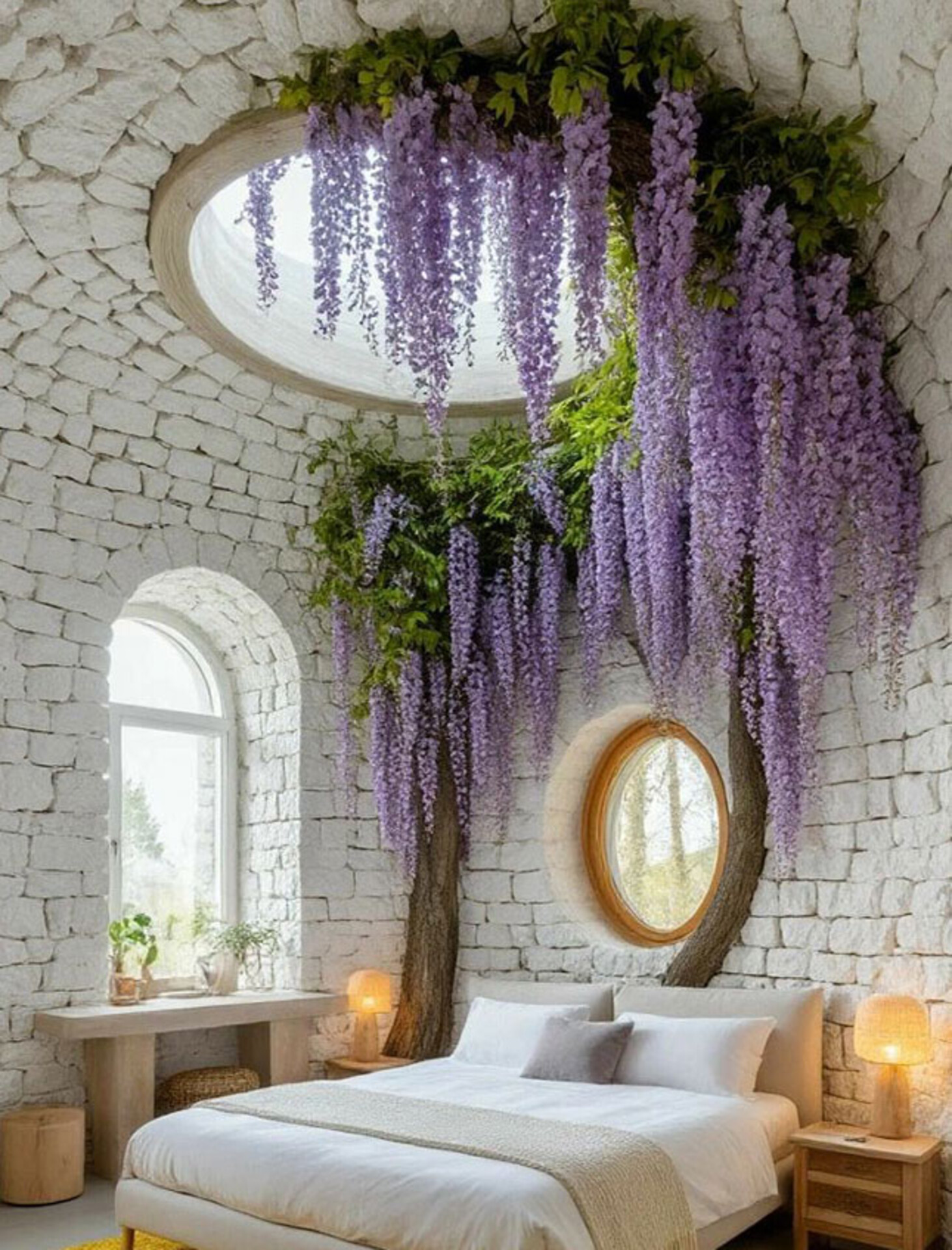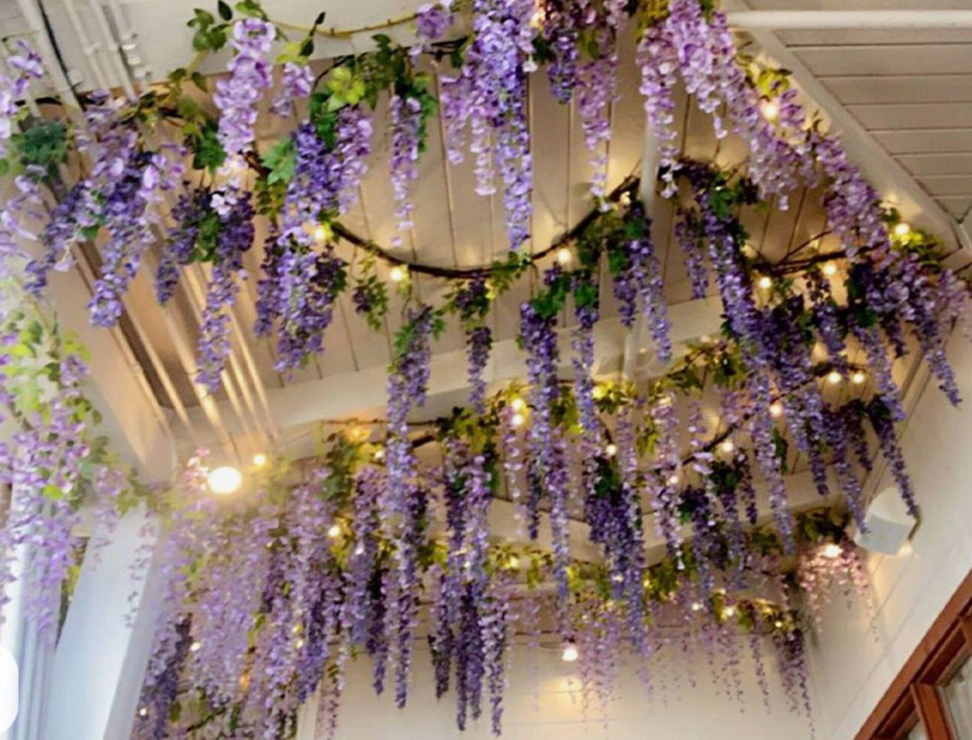 Glicine con tre cadenti e foglie stampate, gli steli sono animati ed i pendenti di diversa misura creano un gradevole effetto a caduta che armonizza spazi importanti nel movimento passivo delle composizioni, nel decoro di archi. vasi, frontali di chiese ed altro ancora, un fiore artificiaale che sa conferire movimentio interessanti alle composizioni di fiori diversi, un elemento che lega forme e grafiche con efficacia e sobrietà.