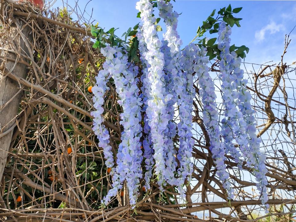 Glicine cadente con 3 braccia e foglie stampate, gli steli sono animati ed i pendenti di diversa misura creano un gradevole effetto a caduta che armonizza spazi importanti nel movimento passivo delle composizioni, nel decoro di archi. vasi, frontali di chiese ed altro ancora, un fiore artificiaale che sa conferire movimentio interessanti alle composizioni di fiori diversi, un elemento che lega forme e grafiche con efficacia e sobrietà.