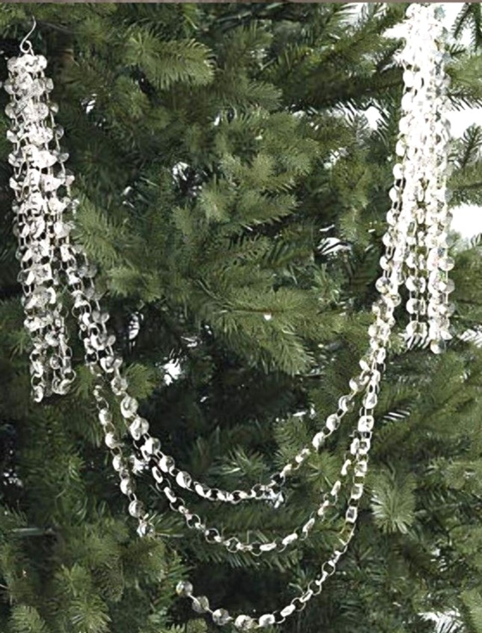Collane di cristalli sfaccettati rotondi uniti da anelletti di metallo, é elegante e di bella trasparenza, adatte nella decorazione per evidenziare continuità di punti luce dove i raggi si scompongono irradiandosi nell'iride.