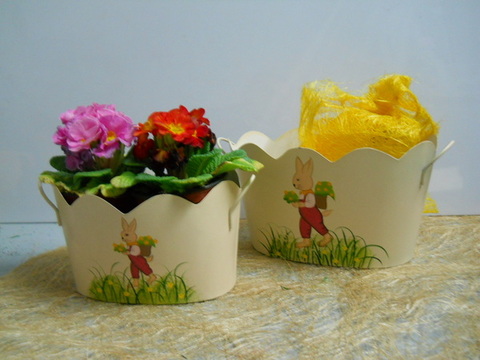 Contenitore in latta beige con decoro, coprivaso adatto per contenere una o due piante fiorite. resistente e di lunga durata decora con simpatia balconi e mensole.